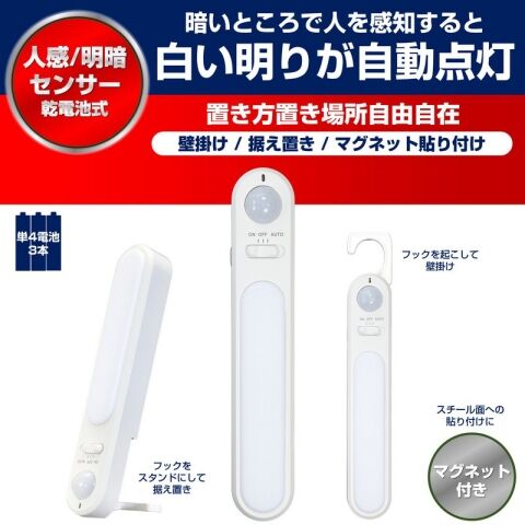 ※電池の性能、使用条件により電池寿命は短くなる場合があります。 - 点灯保持時間(約):約13秒(暗い時に人を検知すると自動で点灯し、約13秒後に自動で消灯します)
