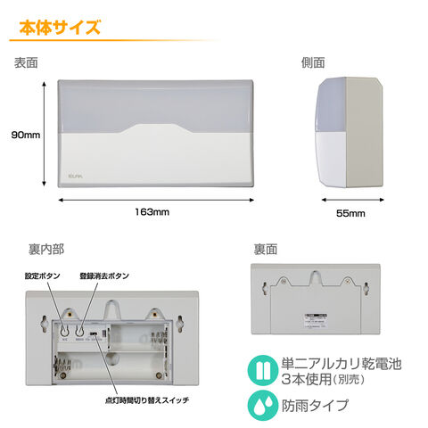 - 電池寿命:約1年(1日に10回、点灯時間10秒で使用) ※アルカリ乾電池使用時 ※電池の性能、使用条件により電池寿命は短くなる場合があります。