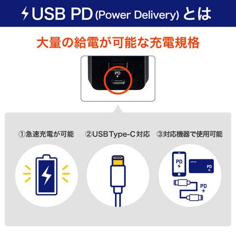PD(パワーデリバリー)対応スマートフォン、タブレット等を超速充電できます。(※)