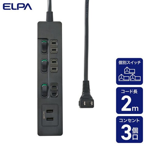 ELPA 個別スイッチ付き 電源タップ(AC3個口+USB2ポート、2m) ブラック ELPA USBランプレス スイッチ付タップ WLS-E3232UA(BK) 【返品種別A】