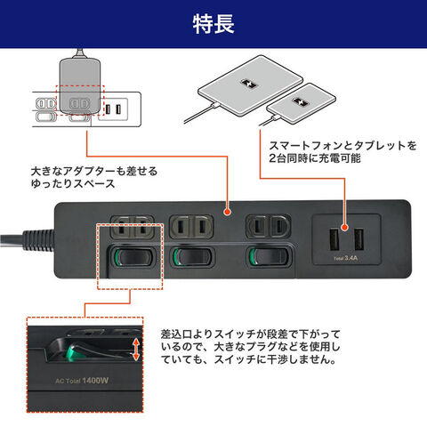 ELPA 個別スイッチ付き 電源タップ(AC3個口+USB2ポート、2m) ブラック ELPA USBランプレス スイッチ付タップ WLS-E3232UA(BK) 【返品種別A】のレビュー