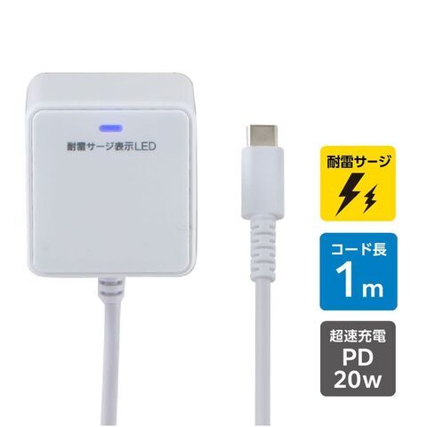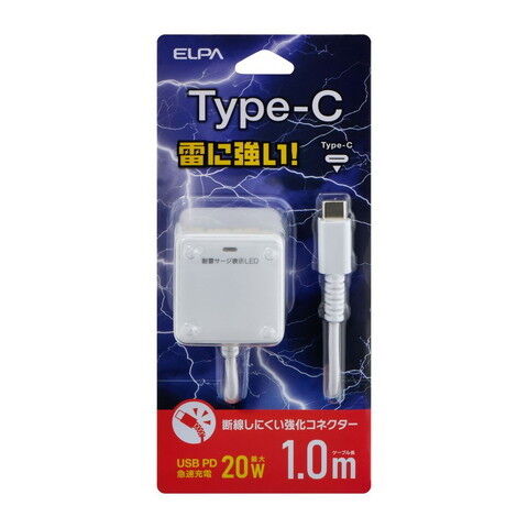 ELPA 雷サージ付き 耐雷USB充電器PD1m USB-Cケーブル一体型 PD 20W 折りたたみプラグ(ホワイト) CHCR-SP10WH 【返品種別A】