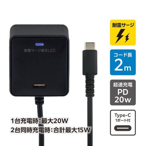 ELPA 雷サージ付き 耐雷USB充電器C付PD2m USB-Cケーブル一体型 +USB-C×1 PD 20W 折りたたみプラグ(ブラック) CHCR-SPC20BK 【返品種別A】