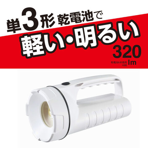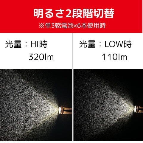 ・単3形アルカリ乾電池×6本使用時:HI 320ルーメン/LOW 110ルーメン