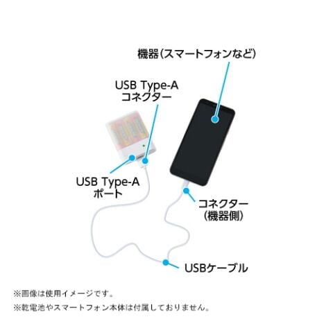 AC電源やモバイルバッテリーが使用できない緊急時に手軽に買える単3形アルカリ乾電池×4本を入れるとスマートフォンへ充電ができます。