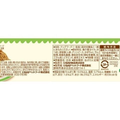 ■原材料:魚介類(まぐろ、かつお)、野菜類(人参、グリンピース、かぼちゃ)、でん粉類、殺菌乳酸菌、増粘安定剤(増粘多糖類、加工でん粉)、ビタミンE、緑茶エキス