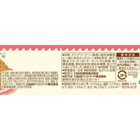 ■保証成分値:たんぱく質10.5%以上、脂質0.7%以上、粗繊維0.4%以下、灰分1.6%以下、水分86.5%以下