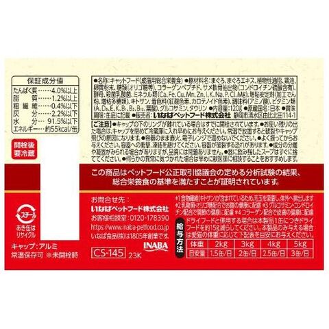 ■原材料:まぐろ、まぐろエキス、植物性油脂、鶏油、卵黄粉末、糖類(オリゴ糖等)、コラーゲンペプチド、サメ軟骨抽出物(コンドロイチン硫酸含有)、酵母、殺菌乳酸菌、ミネラル類(Ca、Fe、Cu、Mn、Zn、I、K、Na、P、Cl、Mg)、増粘安定剤(加工でん粉、増粘多糖類)、キトサン、着色料(紅麹色素、カロテノイド色素)、調味料(アミノ酸)、ビタミン類(A、D3、E、K、B1、B2、B12、葉酸)、グルコサミン、タウリン