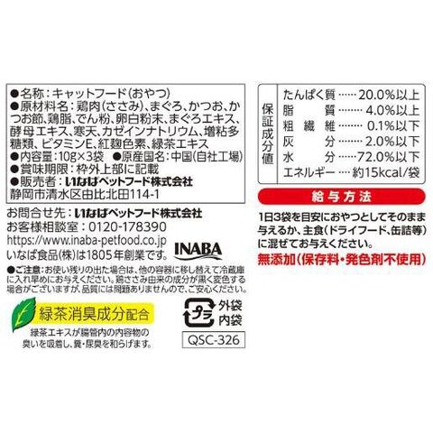 ■原材料:鶏肉(ささみ)、まぐろ、かつお、かつお節、鶏脂、でん粉、卵白粉末、まぐろエキス、酵母エキス、寒天、カゼインナトリウム、増粘多糖類、ビタミンE、紅麹色素、緑茶エキス