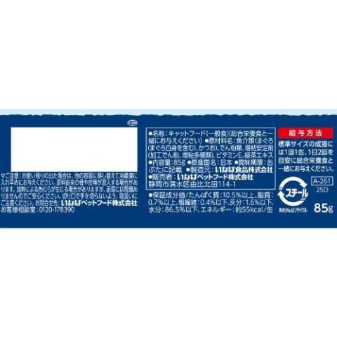 ■保証成分値:たんぱく質10.5%以上、脂質0.7%以上、粗繊維0.4%以下、灰分1.6%以下、水分86.5%以下