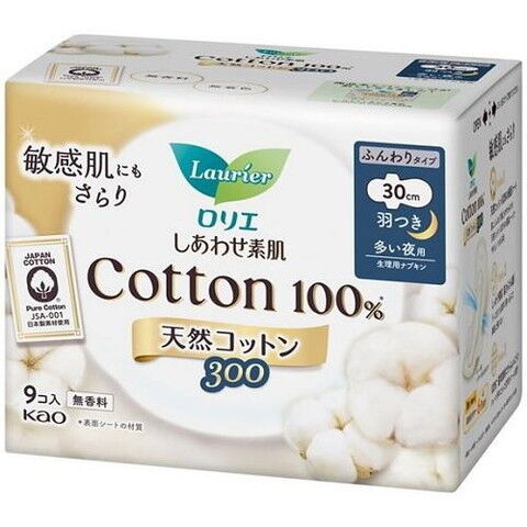花王 ロリエ しあわせ素肌 天然コットン100% 多い夜用30cm 羽つき 9個入 ロリボタニカル30ヨルW9ムコウ 【返品種別A】