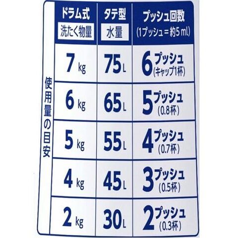 ■成分:界⾯活性剤[47%、⾼級アルコール系(⾮イオン)、⾼級アルコール系(陰イオン)、ヒドロキシアルカンスルホン酸塩]、安定化剤、抗菌剤、消臭助剤、酵素
