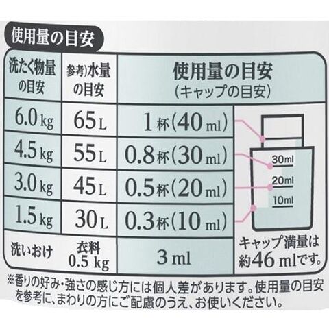■成分:界面活性剤(エステル型ジアルキルアンモニウム塩、ポリオキシエチレンアルキルエーテル)、安定化剤、香料