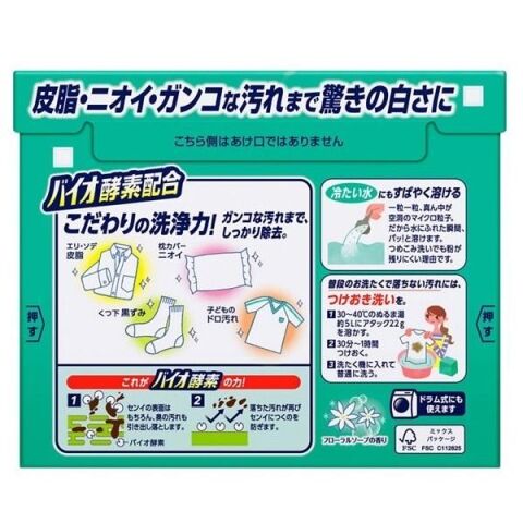 ■成分:界面活性剤(19%、直鎖アルキルベンゼンスルホン酸ナトリウム、ポリオキシエチレンアルキルエーテル)、アルカリ剤(炭酸塩)、水軟化剤(アルミノけい酸塩)、工程剤(硫酸塩)、分散剤、蛍光増白剤、酵素
