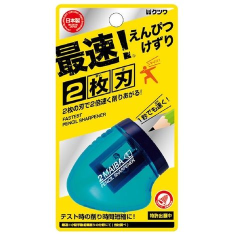 ◆2枚の刃で2倍速く削りあがる! 従来の1枚刃手動鉛筆削りの約2倍の速さで削ることができる。少ない回転数で削ることができるので、刃が長持ち。