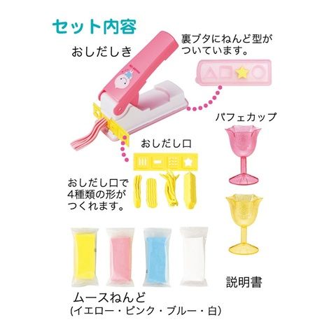 - 素材:(ねんど)有機微小中空球体・パルプ繊維・粘結剤・保存剤・水・色素/(おしだしき)ABS・PE・PP/(パフェカップ)AS/(説明書)紙