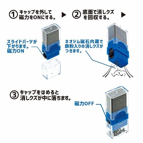 ◆キャップをはめると磁力がOFFになり、消しクズが中に落ちてキャップ内にためられます