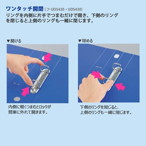 リングを内側に片手でつまむだけで開き、下側のリングを閉じると上側のリングも一緒に閉じます
