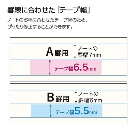 ◆ノートの罫幅に合わせたテープ幅のため、ぴったり修正することができます。※A罫・B罫からお選びいただけます。