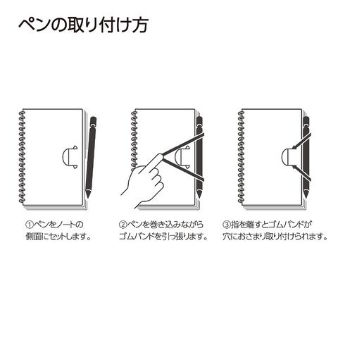 ◆筆記具全体をゴムバンドで巻き込んで留めるので、筆記具のクリップの有無に限らずホールドすることが可能です。