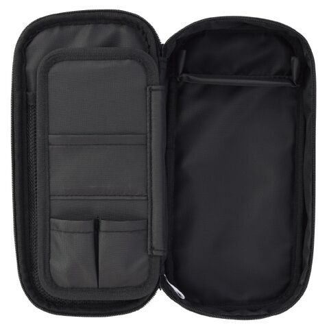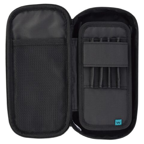フタ裏には定規などが入るメッシュポケット、ペントレー裏にはシャープ替芯2個とふせんが入る薄型ポケット。下段は消しゴムや修正テープ用の小物スペースと約15本のペンが収容できる大スペースに仕切られているため、整理しやすく取り出しやすい。