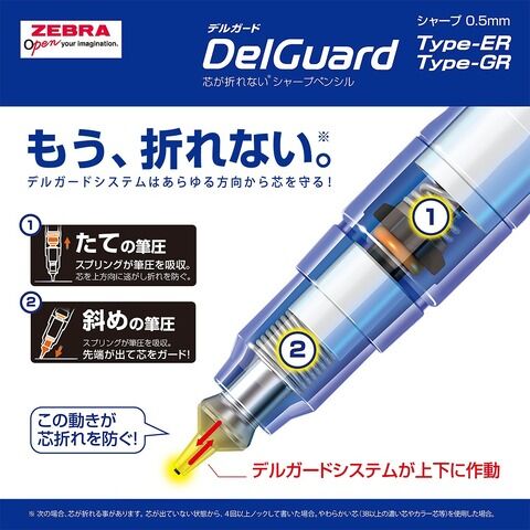 ◆筆圧や書く角度に合わせて芯をガードする新開発の内部機構により、どれだけ強い力をかけても芯が折れないシャープペン。