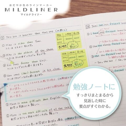 ◆通常の蛍光ペンと比べて蛍光感が控えめで目がちかちかしないので、文字を目立たせても、読み返しやすいノートや手帳に仕上がります。