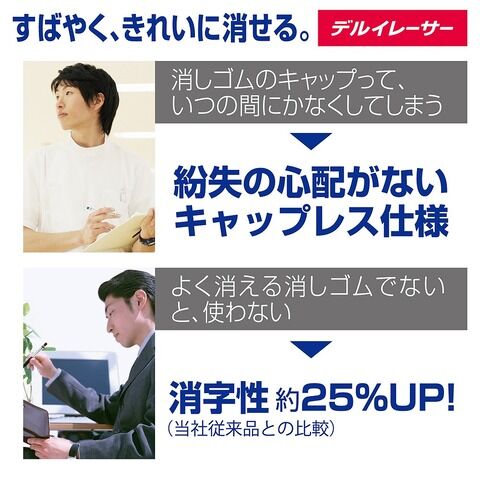 ◆逆さにするだけで消しゴムが出てきます。消しゴムのキャップレスを実現し、本体の向きを変えるだけで使えるので、キャップを外す手間がかからず集中力を途切れさせません。