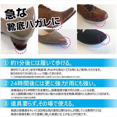 ◆急にはがれた靴底を貼り合わせ約1分間で応急接着が可能。