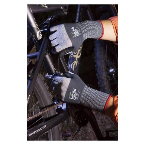 ◆マイクロファイバーの編み目を密にすることで肌への密着性を高め、手袋内面のスベリ止め効果を高めています。