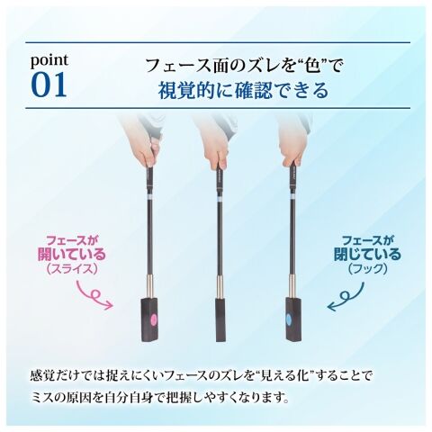 ヘッド部分に貼られたブルーとピンクの2色シールにより、インパクト前後のフェース面の開閉状態をスイングしながら視覚的に確認できます。