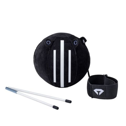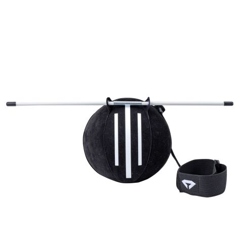 空気を入れて膨らましボールを両腕で挟みながら胸に当てることで、体と腕の回転を同調させ、腕の三角形をキープ・意識したボディターンでのスイングを習得できます。