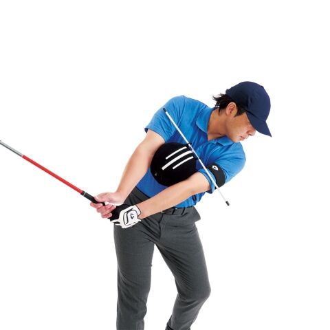 また、両足に挟むことで下半身が安定し、余計なスウェーや腰の回転を防ぎます。