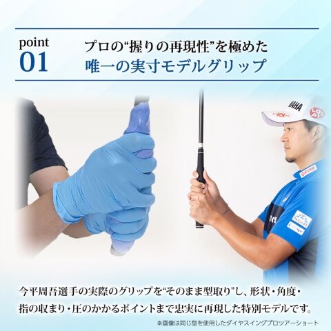 今平周吾プロの実際のグリップを型取りし、指の配置や角度、握圧のかかるポイントまで忠実に再現。
