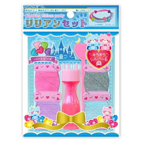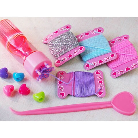 - 内容:ピンクの編み機、編み棒、4色の糸(キラキラシルバー糸入り)、5色のハートビーズ
