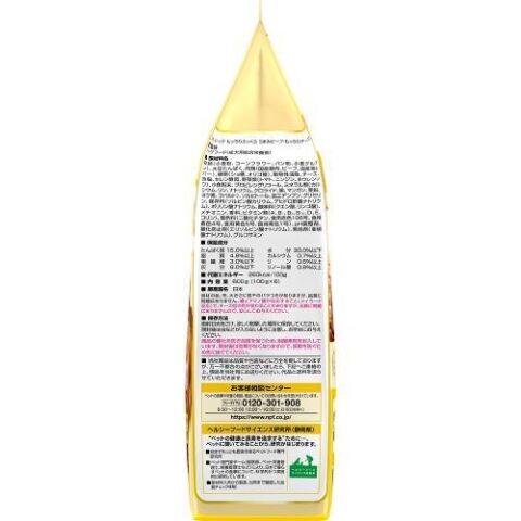 穀類(小麦粉、コーンフラワー、パン粉、小麦グルテン)、大豆たんぱく、肉類(国産鶏肉、ビーフ、国産鶏レバー)、糖類(ショ糖、オリゴ糖)、動物性油脂、チーズ、食塩、セレン酵母、野菜類(トマト、ニンジン、ホウレンソウ)、小魚粉末、プロピレングリコール、ミネラル類(カルシウム、リン、ナトリウム、クロライド、銅、マンガン、亜鉛、ヨウ素、コバルト)、ソルビトール、加工デンプン、グリセリン、保存料(ソルビン酸カリウム、デヒドロ酢酸ナトリウム)、ポリリン酸ナトリウム、酸味料(クエン酸、リンゴ酸)、メチオニン、香料、ビタミン類(A、B1、B2、B12、D、E、コリン)、着色料(二酸化チタン、食用赤色106号、食用黄色4号、食用黄色5号、食用青色1号)、pH調整剤、酸化防止剤(エリソルビン酸ナトリウム)、発色剤(亜硝酸ナトリウム)、グルコサミン