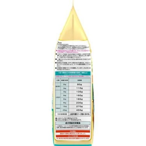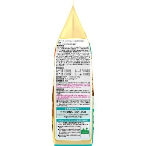 ■保証成分:たんぱく質15.0%以上、脂質4.5%以上、粗繊維3.0%以下、灰分8.0%以下、水分30.0%以下、カルシウム0.7%以上、リン0.6%以上、リノール酸0.8%以上