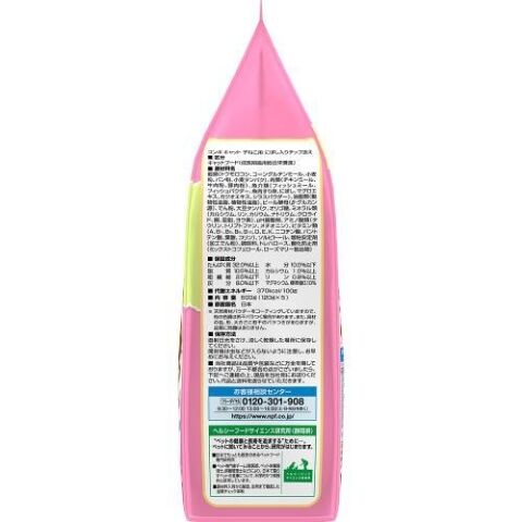 穀類(トウモロコシ、コーングルテンミール、小麦粉、パン粉、小麦タンパク)、肉類(チキンミール、牛肉粉、豚肉粉)、魚介類(フィッシュミール、フィッシュパウダー、魚肉すり身、にぼし、マグロエキス、カツオエキス、シラスパウダー)、油脂類(動物性油脂、植物性油脂)、ビール酵母(β-グルカン源)、でん粉、大豆タンパク、オリゴ糖、ミネラル類(カルシウム、リン、カリウム、ナトリウム、クロライド、銅、亜鉛、ヨウ素)、pH調整剤、アミノ酸類(タウリン、トリプトファン、メチオニン)、ビタミン類(A、B1、B2、B6、B12、D、E、K、ニコチン酸、パントテン酸、葉酸、コリン)、ソルビトール、増粘安定剤(加工でん粉)、調味料、トレハロース、酸化防止剤(ミックストコフェロール、ローズマリー抽出物)