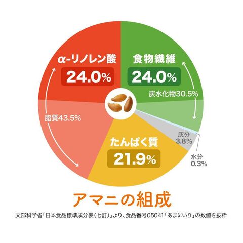 エネルギー:29kcal、たんぱく質:1.0g、脂質:2.3g、n-3系脂肪酸:1.3g、炭水化物:1.6g、糖質:0.4g、食物繊維:1.2g、食塩相当量:0.009g、α-リノレン酸:1.3g、アマニリグナン:33.5mg