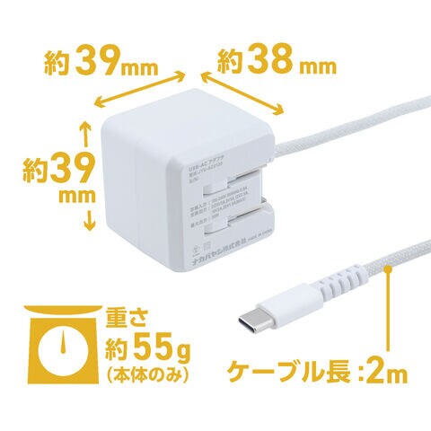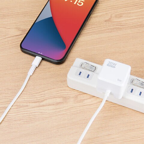 「GaN 30W PD充電器ケーブル一体型」はコンパクトなキューブ型で、高速充電できるPD対応充電器です。