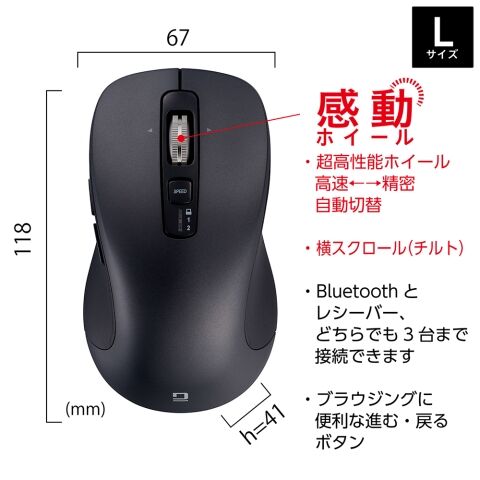 ナカバヤシ 【感動ホイールマウス】 Bluetooth・USB無線(デュアル)静音5ボタンBlueLEDマウス Lサイズ(ブラック) MUS-DKF243BK 【返品種別A】