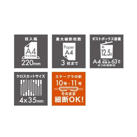 - 定格細断枚数:3枚(A4上質紙64g/m2)※郵便はがき/1枚(厚み0.2mmまで)