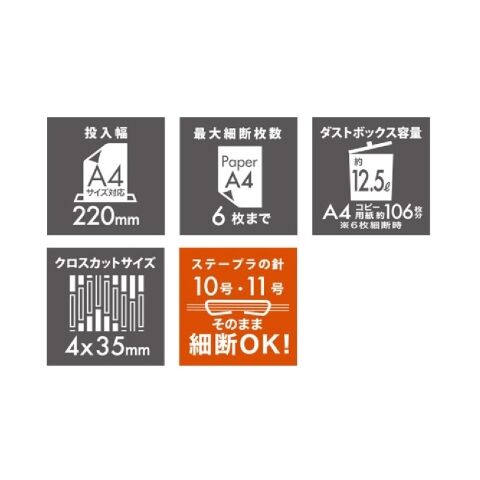 - 最大細断枚数:6枚(A4上質紙64g/m2)※郵便はがき/1枚(厚さ0.2mmまで)