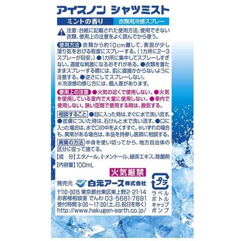 白元アース アイスノン シャツミスト ミントの香り 100ml アイスシヤツミストミントノカオリ100 【返品種別A】
