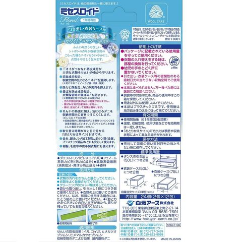 ■成分:プロフルトリン(ピレスロイド系)、フェノール系防カビ剤(防カビ成分)、鉱物系吸着剤(消臭成分・黄ばみ防止成分)、香料