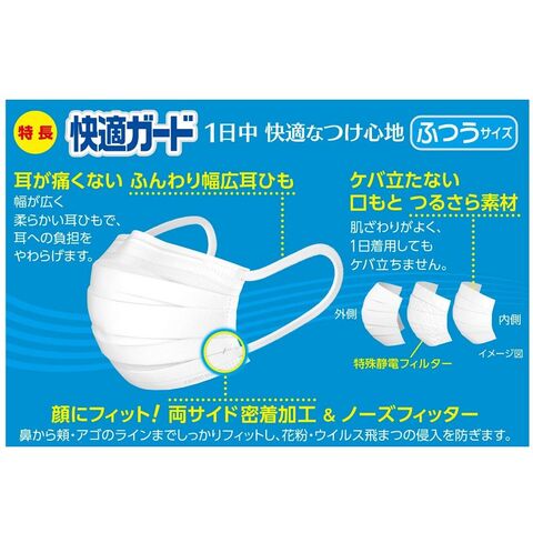 ◆耳が痛くない幅広耳ひもと、肌ざわりがよく、1日着用してもケバ立たない口もとつるさら素材で、1日中快適なつけ心地。