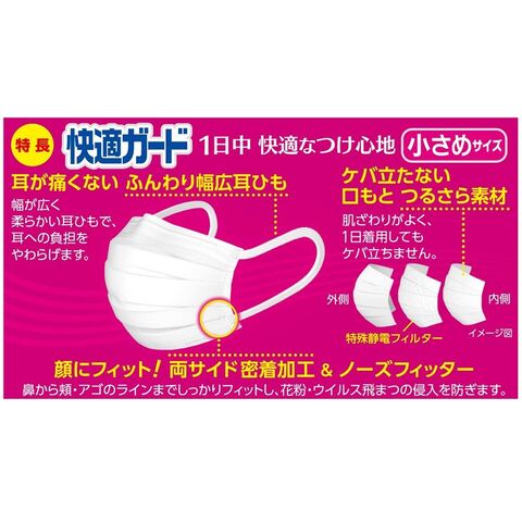 ◆耳が痛くない幅広耳ひもと、肌ざわりがよく、1日着用してもケバ立たない口もとつるさら素材で、1日中快適なつけ心地。