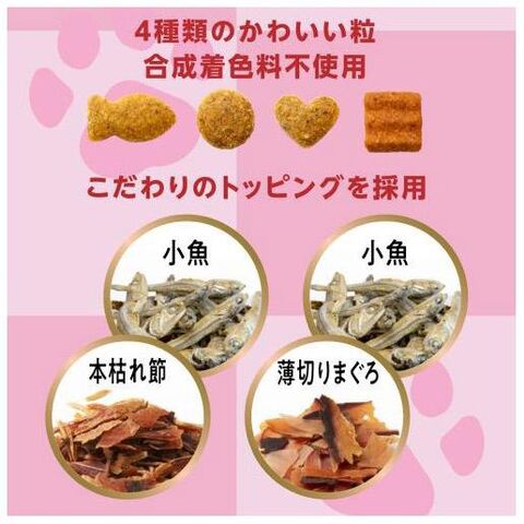 ■原材料:穀類(とうもろこし、小麦粉、コーングルテンミール)、肉類(ミートミール、チキンミール、チキンレバーパウダー)、豆類(脱脂大豆)、油脂類(動物性油脂)、魚介類(フィッシュエキス、白身魚エキス、いりこ、かつお枯れ節削り、まぐろ節)、セレン酵母、ビタミン類(A、D3、E、K3、B1、B2、パントテン酸、ナイアシン、B6、葉酸、ビオチン、B12、コリン、イノシトール)、ミネラル類(カルシウム、リン、ナトリウム、カリウム、塩素、鉄、コバルト、銅、マンガン、亜鉛、ヨウ素)、アミノ酸類(メチオニン、タウリン)、クチナシ色素、酸化防止剤(ローズマリー抽出物、ミックストコフェロール)