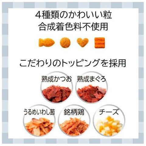 ■原材料:穀類(とうもろこし、小麦粉、コーングルテンミール、コーングルテンフィード)、肉類(ミートミール、チキンミール、チキンレバーパウダー、銘柄鶏(ささみ))、セルロース、油脂類(動物性油脂)、魚介類(フィッシュエキス、白身魚エキス、うるめ煮干削り、熟成まぐろ、熟成かつお)、豆類(脱脂大豆)、乳類(チーズ)、セレン酵母、ビタミン類(A、D3、E、K3、B1、B2、パントテン酸、ナイアシン、B6、葉酸、ビオチン、B12、コリン、イノシトール)、ミネラル類(カルシウム、リン、ナトリウム、カリウム、塩素、鉄、コバルト、銅、マンガン、亜鉛、ヨウ素)、アミノ酸類(メチオニン、タウリン)、クチナシ色素、酸化防止剤(ローズマリー抽出物、ミックストコフェロール)