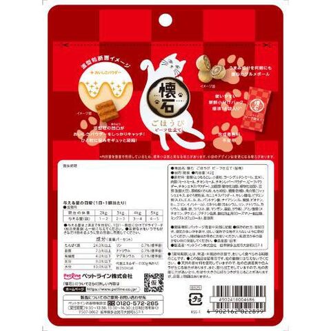 ■原材料:穀類(とうもろこし、小麦粉、コーングルテンミール、玄米)、肉類(ミートミール、チキンミール、チキンレバーパウダー、ビーフパウダー、チキンエキスパウダー)、油脂類(動物性油脂、植物性油脂)、豆類(脱脂大豆)、寒梅粉(でん粉、もち米粉)、糖類(砂糖)、魚介類(フィッシュエキス、まぐろ節粉末、カニエキスパウダー)、セレン酵母、ビタミン類(A、D3、E、K3、B1、B2、パントテン酸、ナイアシン、B6、葉酸、ビオチン、B12、コリン、イノシトール)、ミネラル類(カルシウム、リン、ナトリウム、カリウム、塩素、鉄、コバルト、銅、マンガン、亜鉛、ヨウ素)、アミノ酸類(メチオニン、タウリン)、クチナシ色素、酸化防止剤(ローズマリー抽出物、ミックストコフェロール)、膨張剤